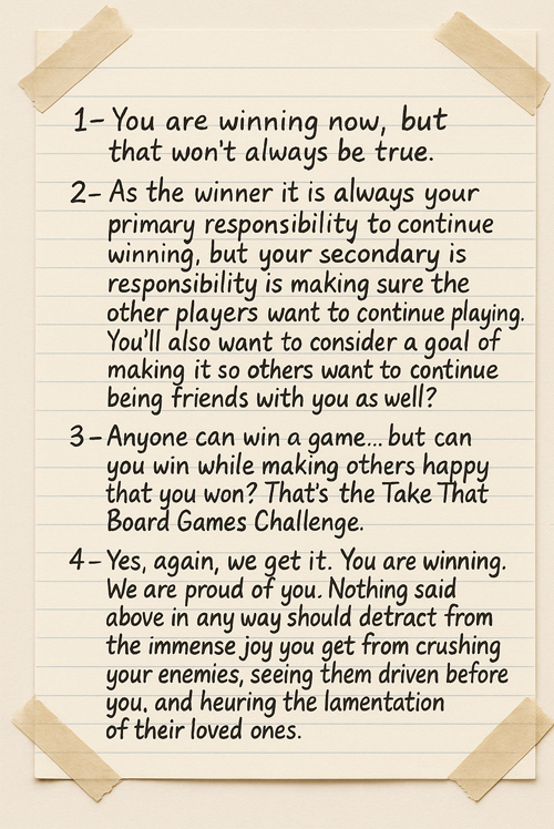 The point of course is that there is more to Winning than just winning. Take That Board Games encourages all players to tape the following list to the back of a hand-mirror that can be kept near the table so that any winner who is failing to behave themselves can endure the anguish of seeing their own face (while being reminded of the following simple axioms):